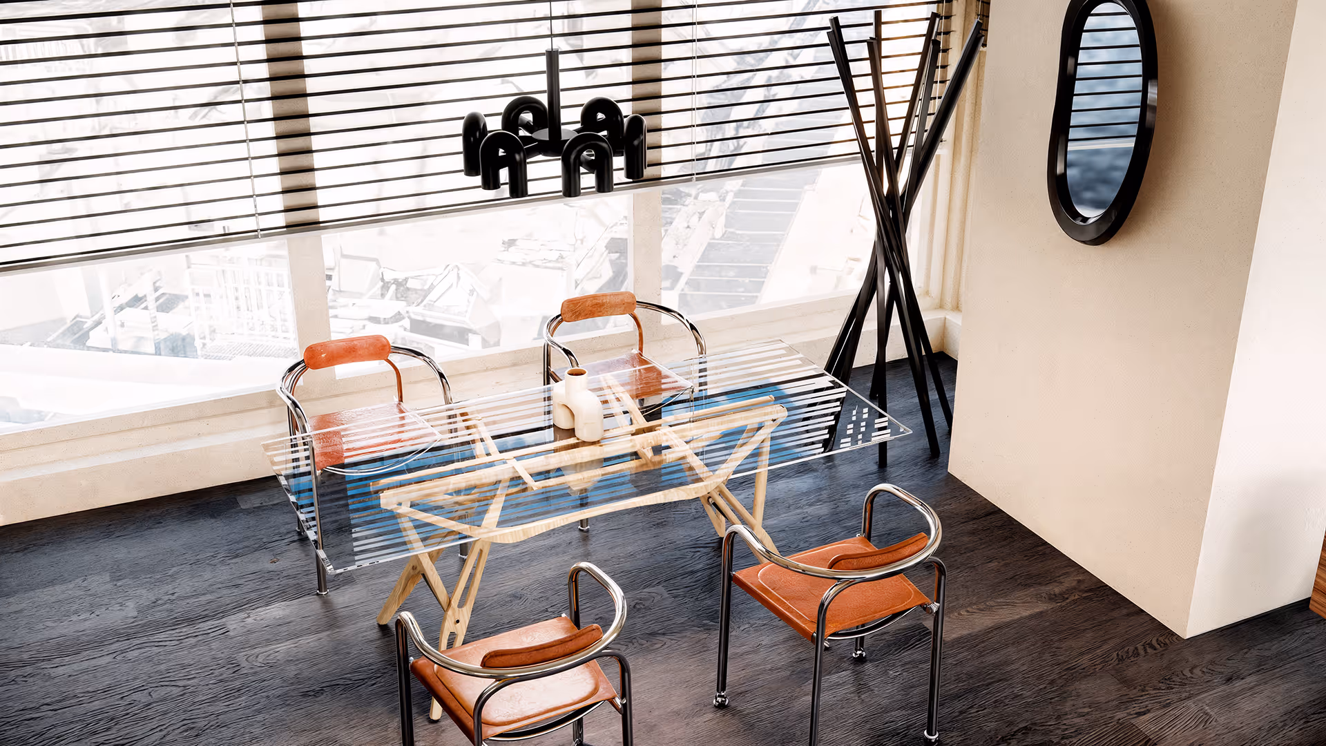 The Ten Thousand dining room was conceptualized as a sanctuary where quiet poetry in form meets practical luxury. The designer leaned into the ethos of Mid-century Interior Design, celebrating natural materials, fluid geometries, and modernist restraint. The focal point is a custom-crafted table with a sculptural wooden base and a glass surface that allows light to dance across its structure. Surrounding chairs with curved chrome arms and saddle leather seats recall timeless icons of 1960s craftsmanship while introducing tactile warmth.