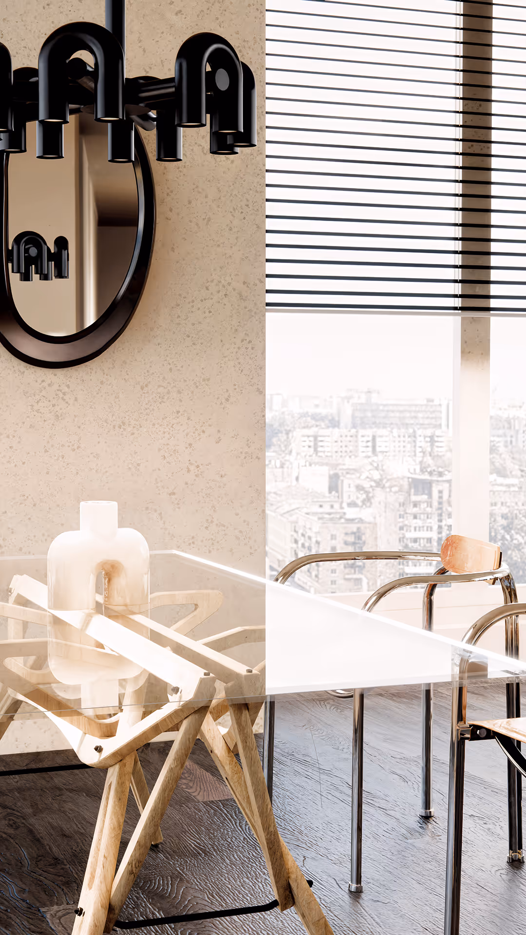 The challenge was to avoid overwhelming the modest footprint while introducing statement pieces. The solution lay in using glass and reflective surfaces to create visual lightness, allowing sculptural furniture to command attention without crowding the space.