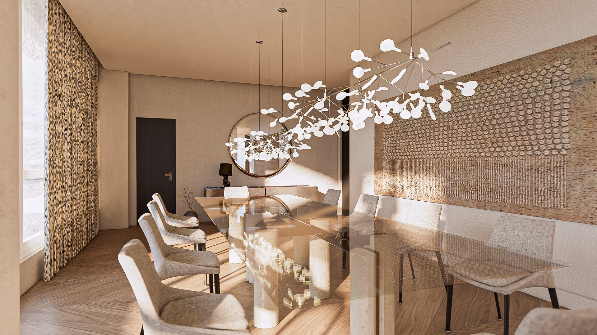The challenge was achieving openness without losing intimacy. The solution was to incorporate transparent and reflective surfaces—glass, mirrors, and polished finishes—that create flow while enhancing warmth through tactile textiles and natural wood flooring.