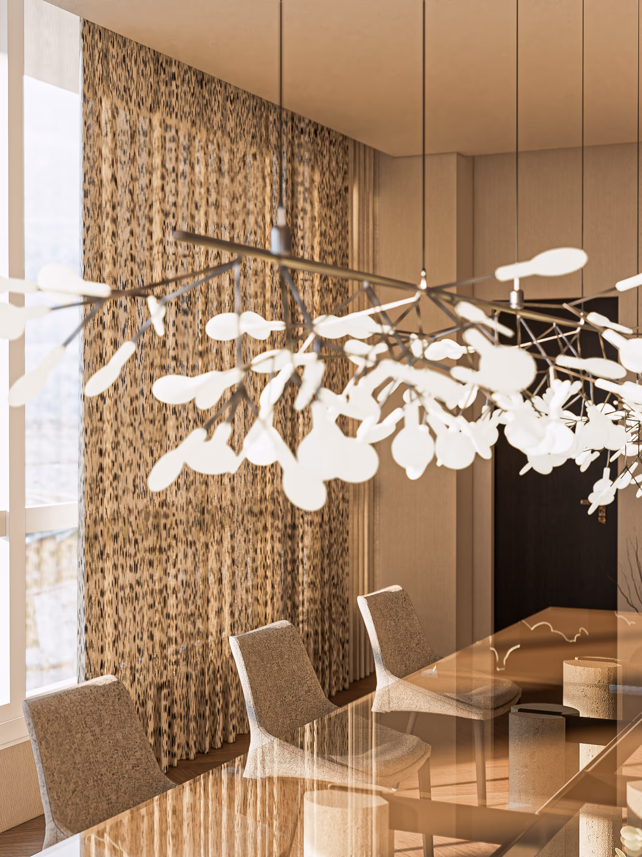 Pendant Lamp: Moooi Heracleum III Linear (by Bertjan Pot) – Inspired by the wild branching of its botanical namesake, this suspended chandelier composes 72 glowing polycarbonate “petals” bursting from a slender metal structure. Fully dimmable, the lamp channels ethereal light and organic drama into expansive interiors.