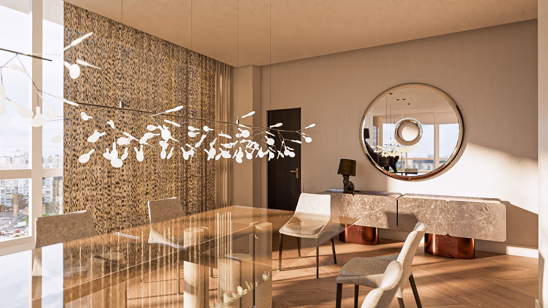 Above, the pendant light takes on the role of a suspended sculpture—organic in form, soft in glow. It offers not only illumination but also a sense of floating artistry, echoing the modern gallery-like feel of the entire residence. A circular mirror graces the wall, reflecting both natural light and city views, subtly expanding spatial perception. The textured wall artwork adds depth, ensuring that every detail contributes tactile richness and visual balance.