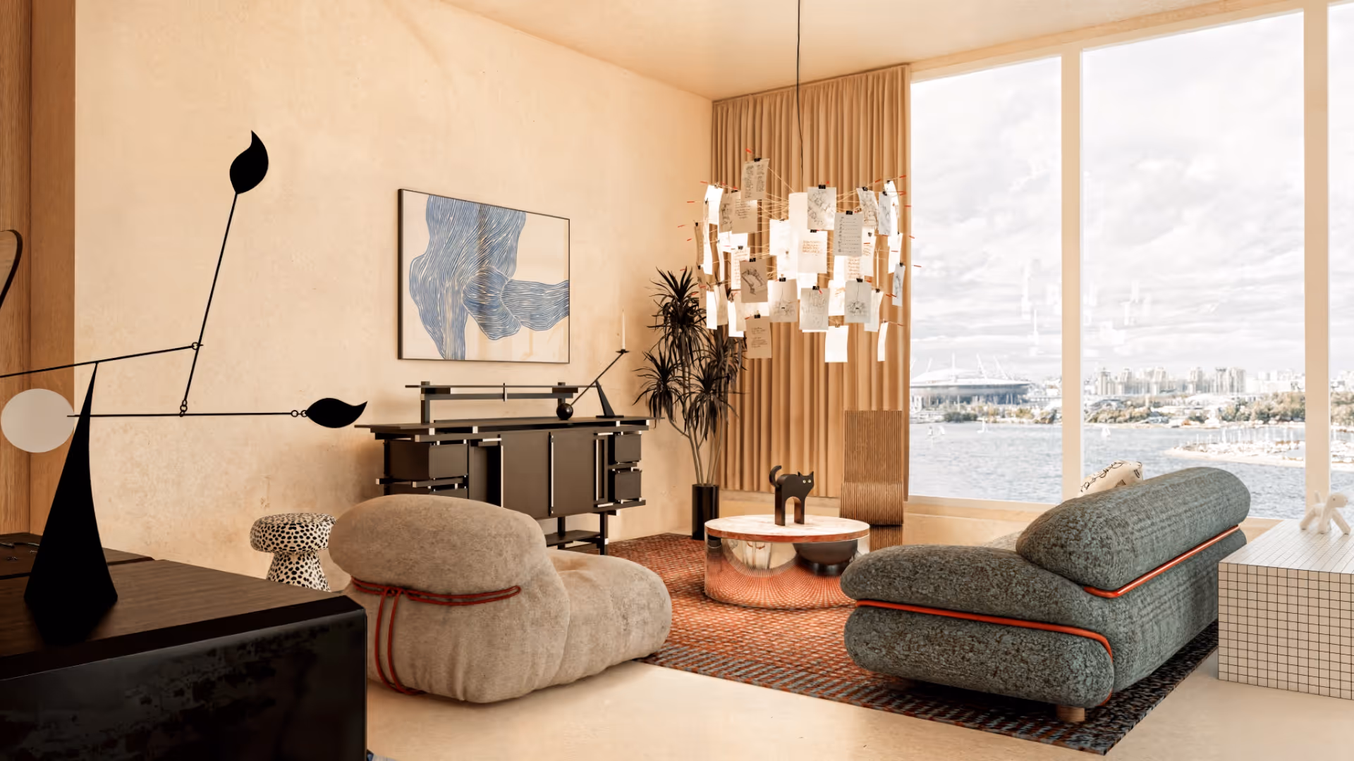 Light pours in through expansive windows overlooking the Marina, filling the space with shifting natural hues that accentuate textures throughout the day. Sculptural chairs with fluid forms defy convention, each selected not only for comfort but for their artistic resonance. The chandelier, composed of layered notes and paper-like elements, functions as both illumination and an artistic installation. Together, these elements weave an ambiance of refinement where the everyday feels extraordinary.