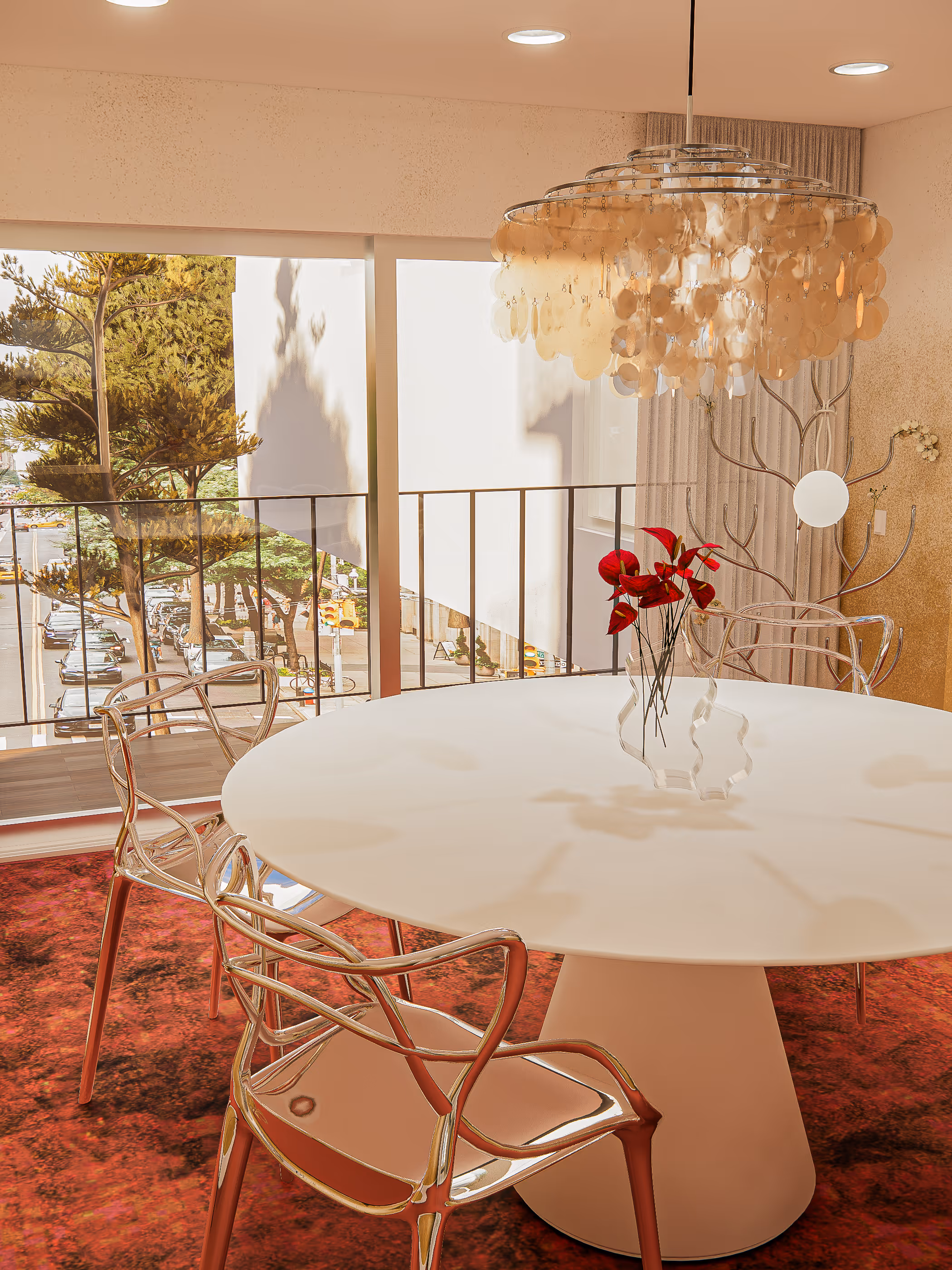 The dining room’s design narrative is rooted in modern art sensibility. The foundation is a bold pink and red carpet, chosen to infuse the space with vibrant energy and contrast against the sleek ivory finishes. A round white table, positioned centrally beneath a dramatic gold-accented chandelier, becomes both a gathering point and a sculptural centerpiece. Gold wall finishes and reflective accents introduce warmth and a touch of glamour, while expansive windows ensure natural light highlights every curve, color, and texture.