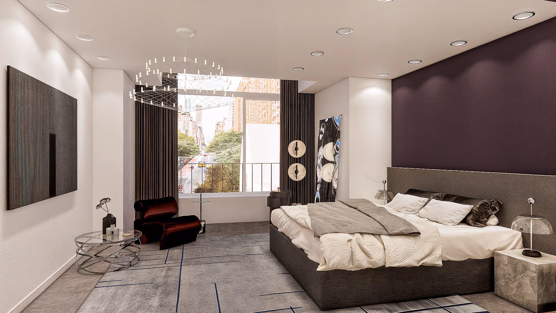 Luxury 3,863 SF bedroom in NY with deep plum accents, sculptural lighting, and statement art for a refined urban retreat.