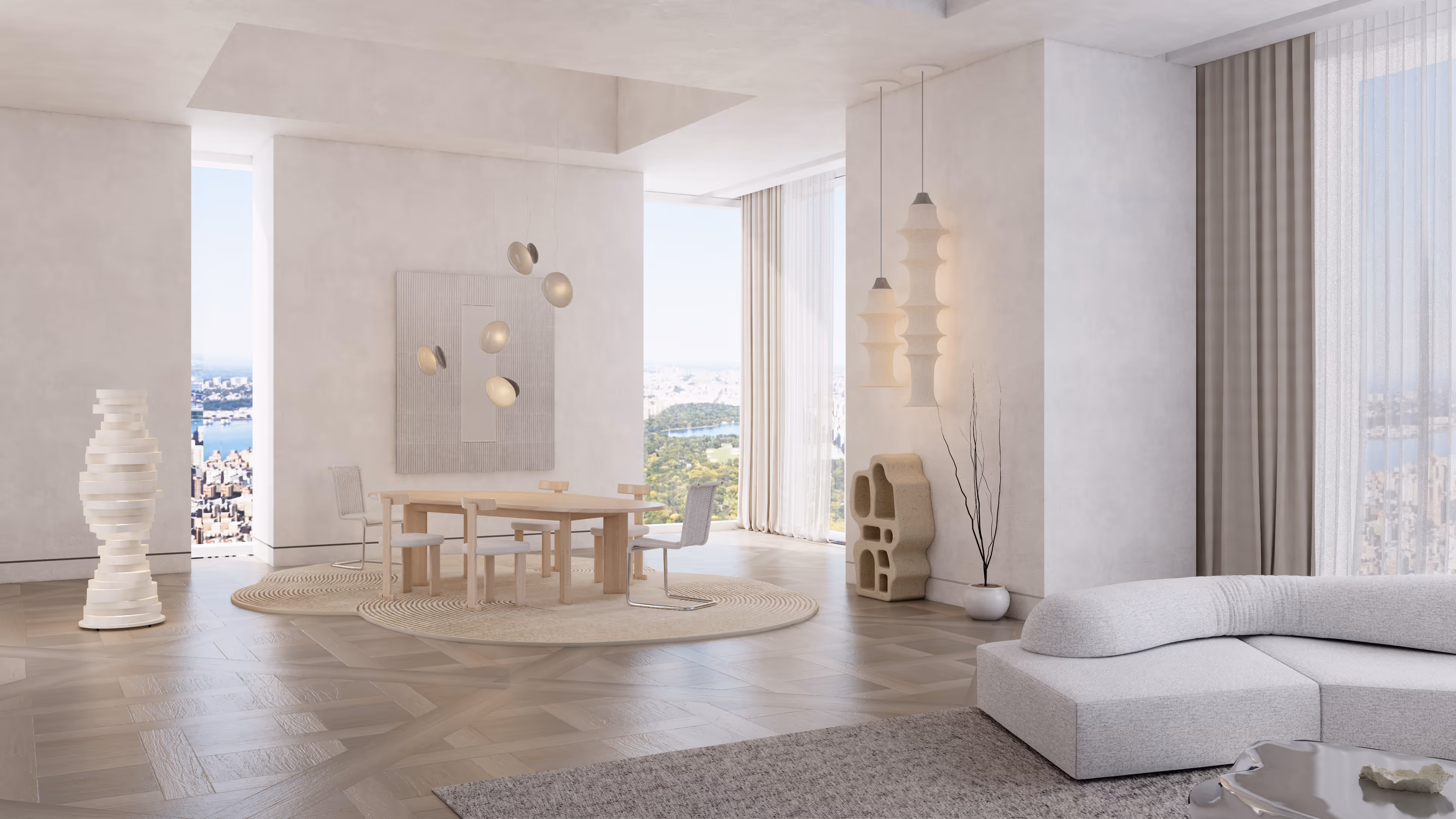 Luxury 7,130 SF minimal neutrals living room at 111 West 57th Street, NY with serene tones, sculptural design, and Central Park views.