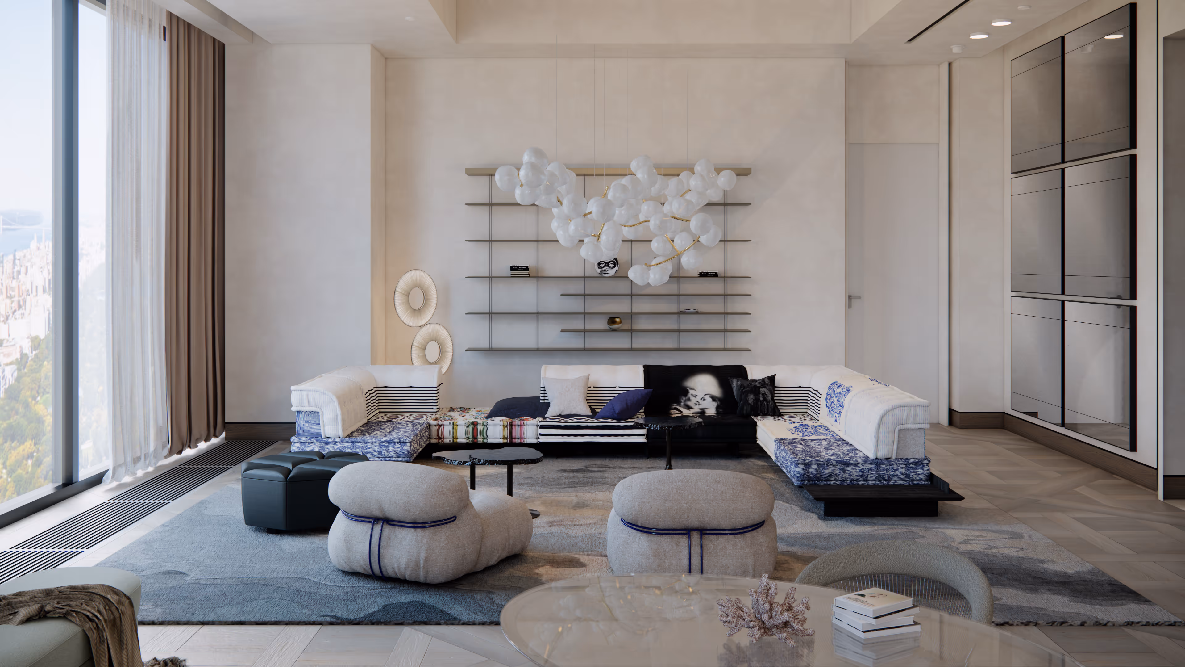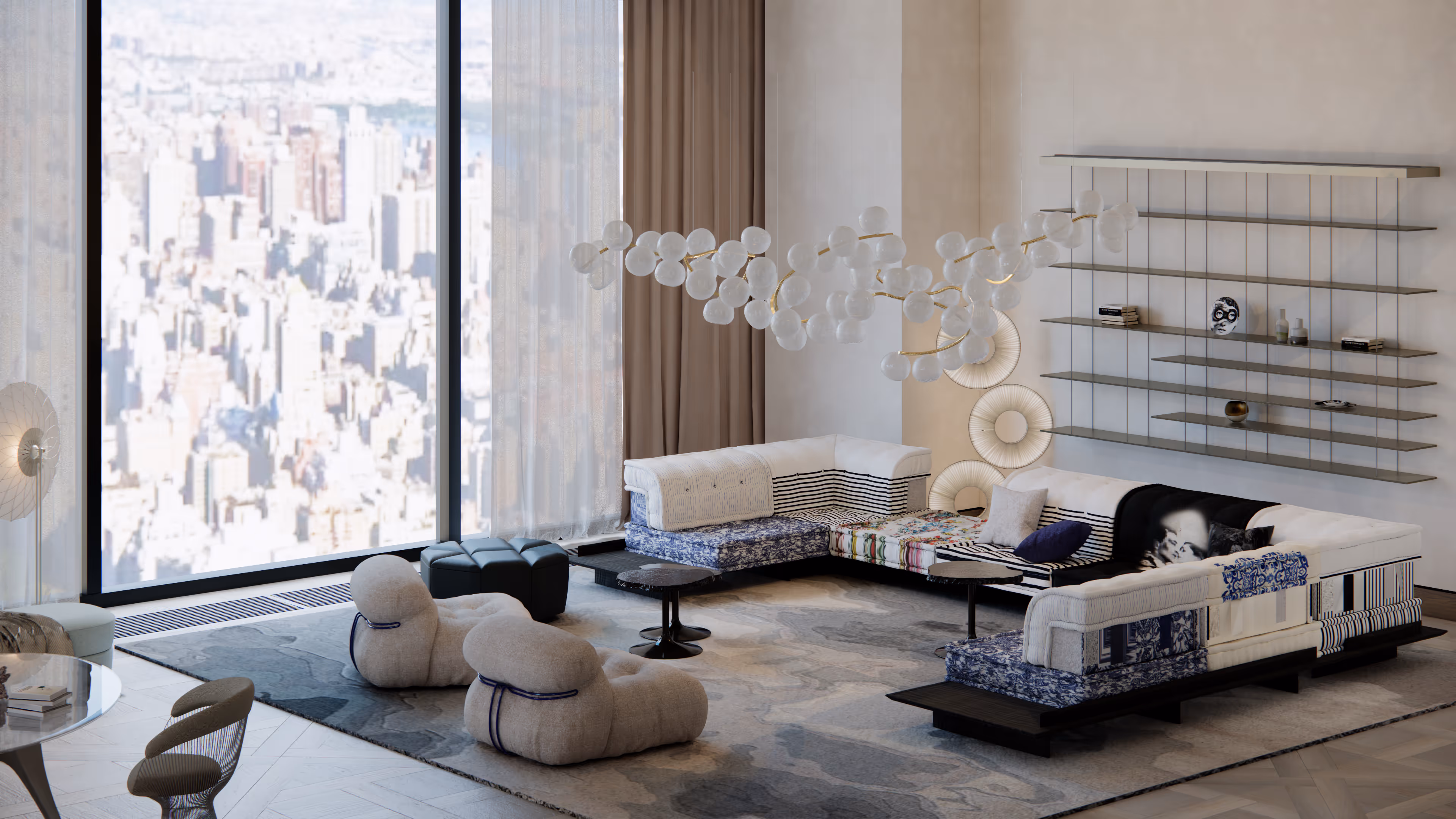 At 111 West 57th Street, a distinguished art entrepreneur has curated a 7130SF living room that embodies the duality of wit and refinement. This New York Luxury Residence combines Luxury Interior Design with collectible High-End Furniture, producing a space that is both visually playful and deeply sophisticated. Designed with the cosmopolitan lifestyle in mind, the living room is a destination in itself, overlooking Central Park with a serene yet vibrant character. In this interior, iconic design houses like Roche Bobois, Cassina, and Moooi harmonize effortlessly with Jean Nouvel’s Graduate Shelving System and The Rug Company’s artisanal rug textures. The owner, an avid collector of contemporary art and design, wanted a space that was flexible for entertaining, yet imbued with a sculptural presence that could rival the finest galleries in Manhattan.