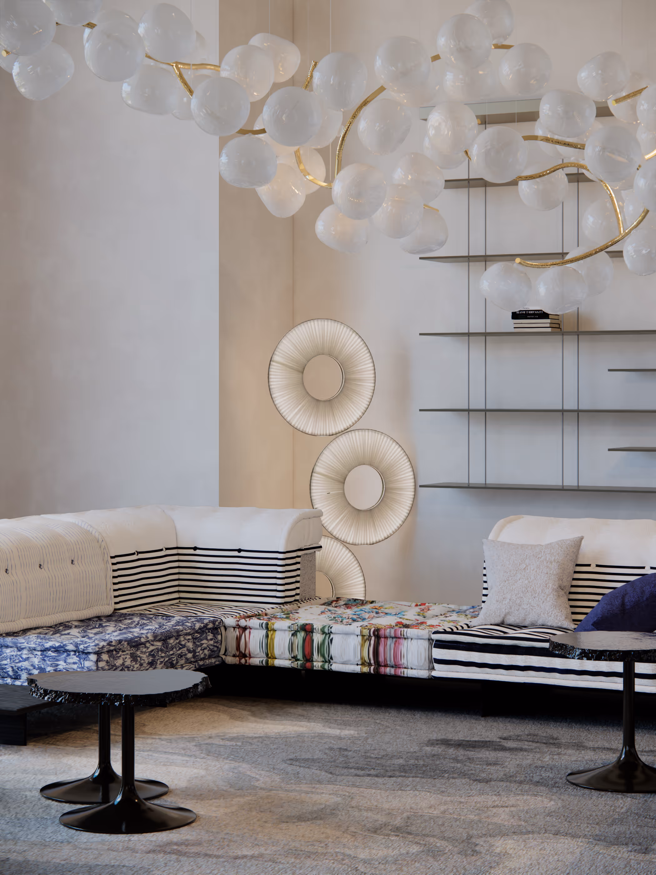 Lighting elevates the space into an immersive artwork. A blossom-inspired chandelier floats like a suspended sculpture, while the Cactus Floor Lamp and Filigree Floor Lamp introduce whimsy and architectural rigor. Rather than a central coffee table, a series of elegant side tables provide fluidity and openness, allowing the layout to evolve depending on social needs. The Rug Company’s Tundra Rug anchors the palette with textured subtlety, while Jean Nouvel’s Graduate Shelving System becomes both functional storage and a piece of architectural ornament.