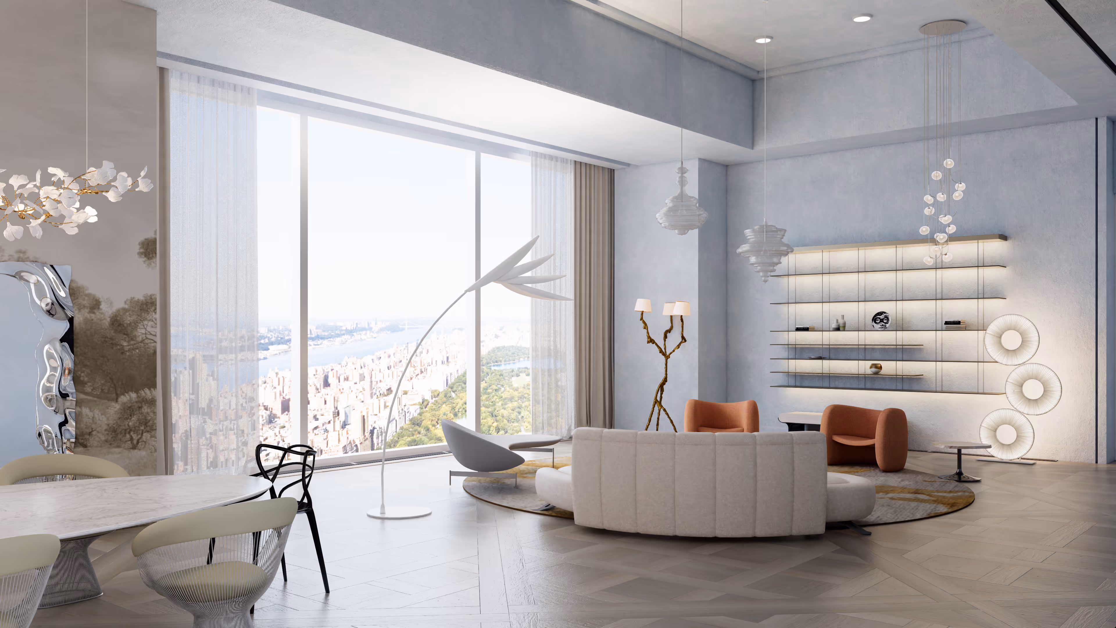 For a fashion entrepreneur who seamlessly blends business with artful living, a home is more than a private retreat—it is a stage for refined experiences and elevated style. Nestled in the heart of New York, this 7,130 SF residence at 111 West 57th Street embodies the pinnacle of contemporary interior design. With a $300,000 investment, the living room becomes a curated sanctuary, balancing minimalism with artistic flair while featuring luxury brands synonymous with global prestige. This residence is designed for those who value the confluence of architecture, art, and luxury living. Expansive windows frame breathtaking Manhattan views, while the interplay of curved sofas, sculptural lighting, and refined textures sets a tone of sophistication. High-end furniture selections and bespoke design gestures ensure that every element not only complements the lifestyle of the homeowner but also redefines the standards of modern luxury.