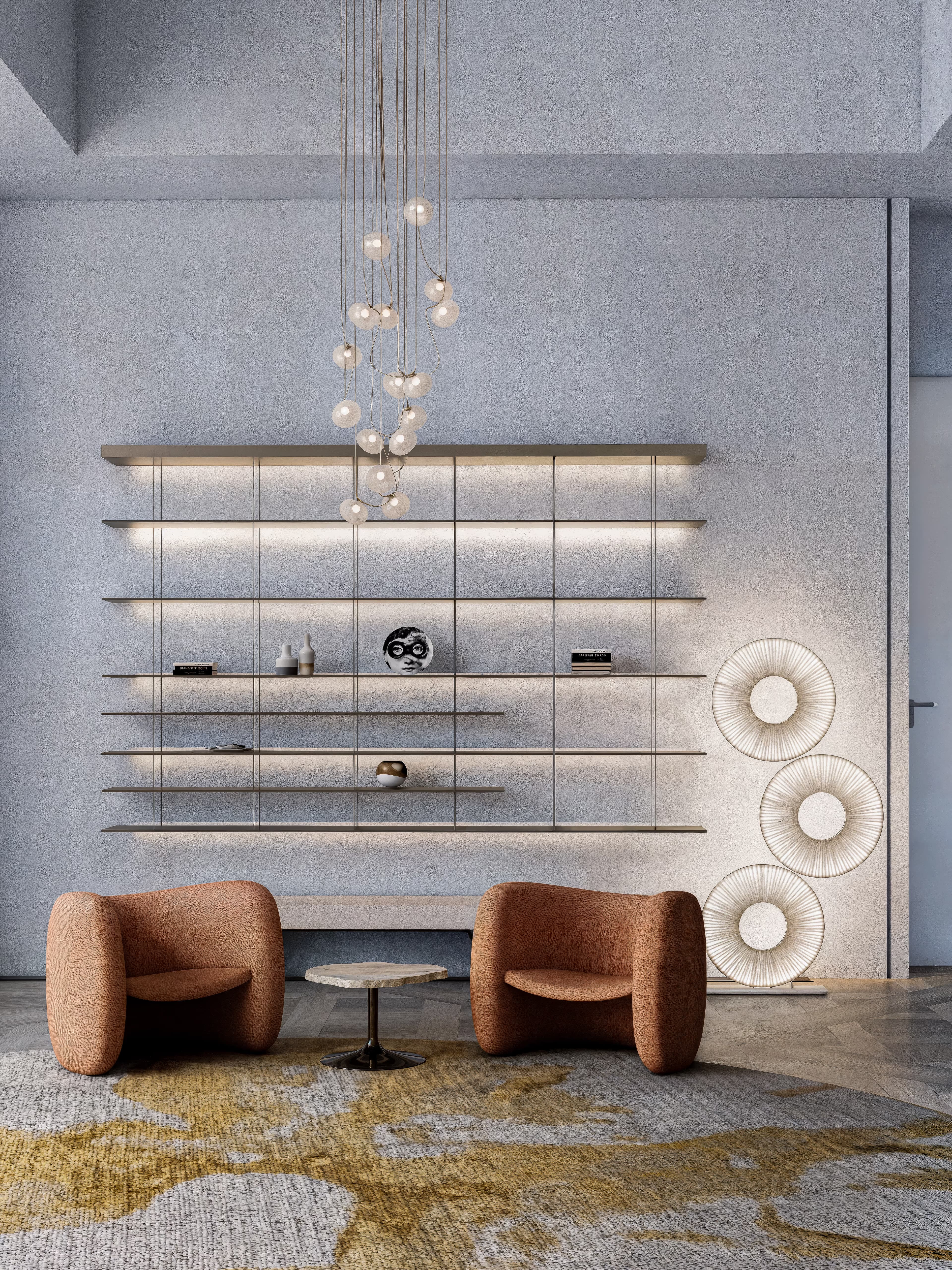 Glass pendant lights cascade like a constellation above, their transparency contrasting beautifully against the rich wooden flooring. Along the wall, slim shelving and a minimalist bench serve both display and functional purposes, underscoring the gallery-like atmosphere. Complementing the furniture is a large, warm-toned rug with hints of gold, weaving the entire composition together and ensuring harmony between modern minimalism and luxurious comfort.