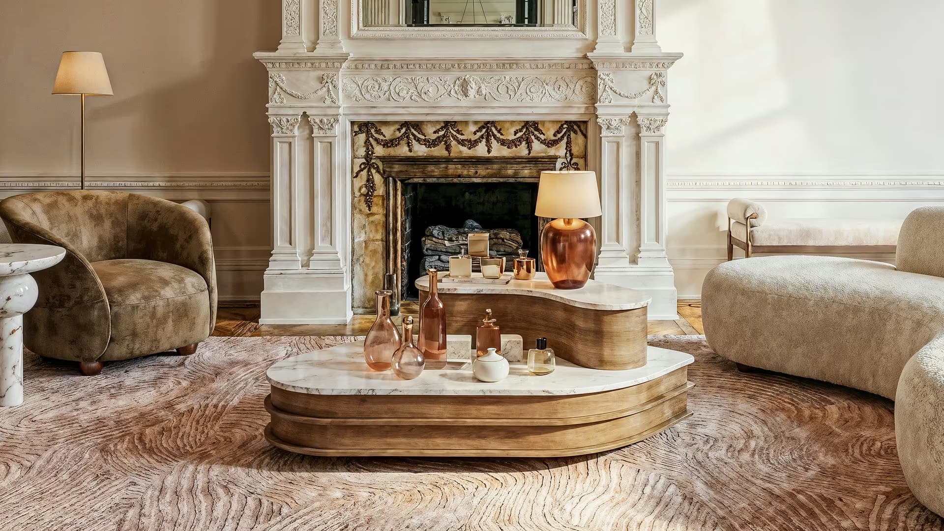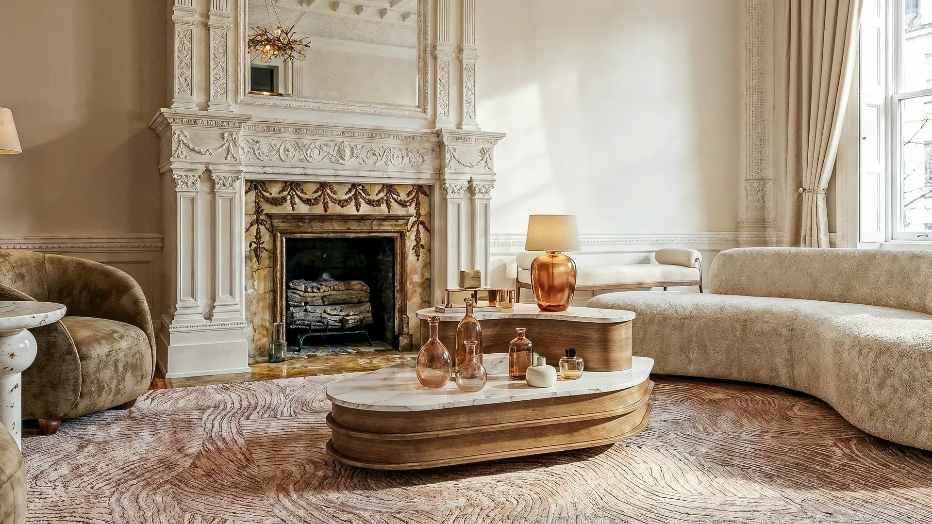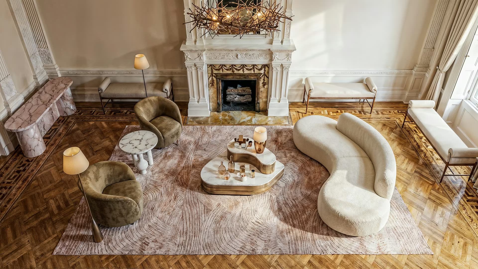 In particular, the overall impression of the space is defined by the curved sofa and lounge chairs, whose contemporary sculptural presence becomes the focal point of the room. Set against the classical backdrop, these fluid silhouettes soften the formality rather than reinforcing it, gently loosening the atmosphere and proposing a kind of luxury that feels both artful and comfortably livable a space that reads like a work of art, yet invites you to stay.
