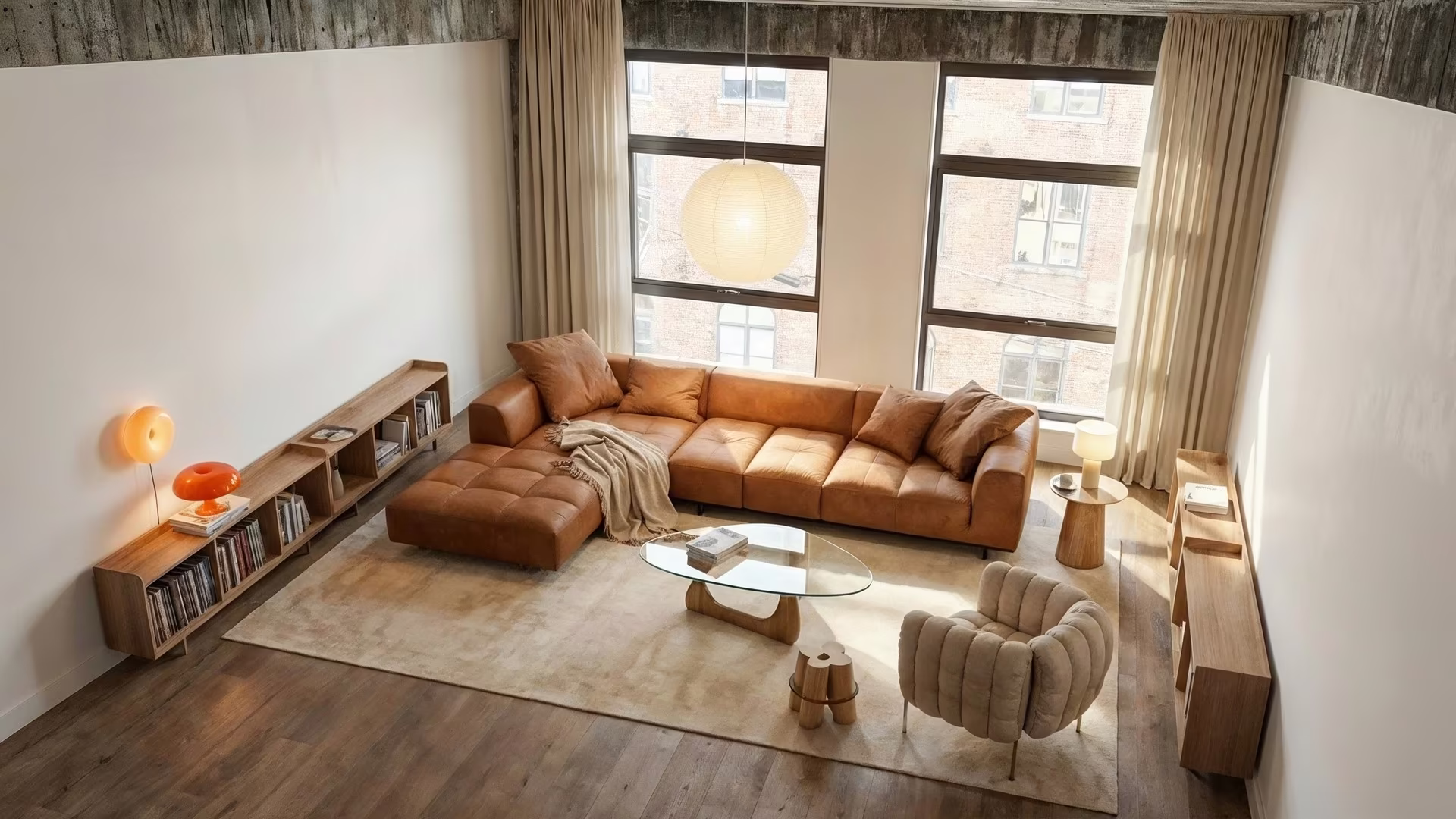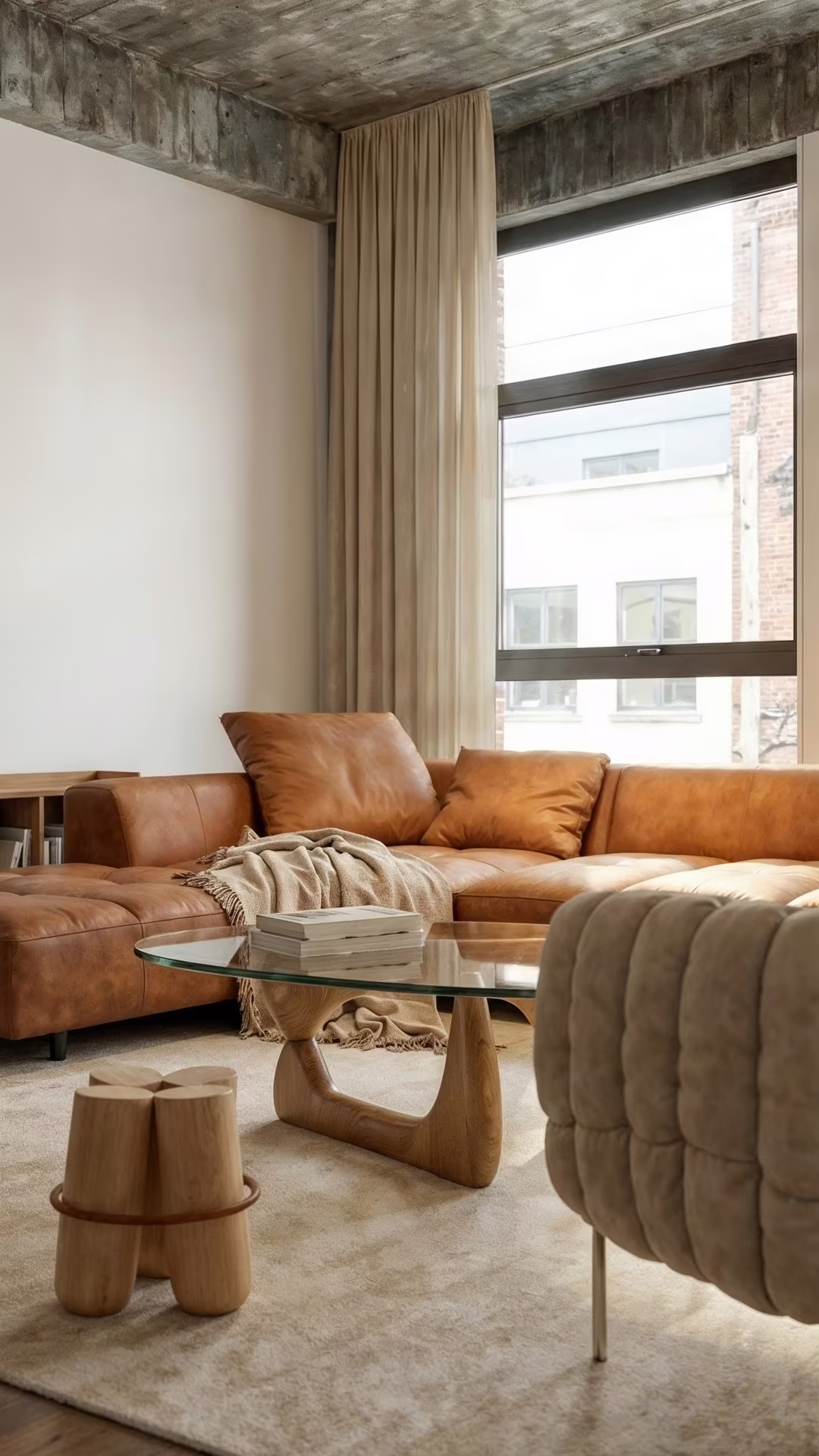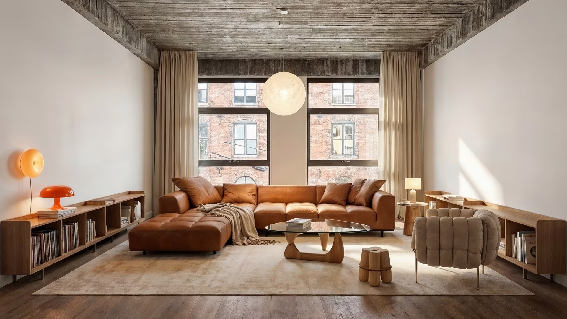 In the heart of New York City, where architectural restraint meets warm, artful living, this residence presents a refined interpretation of the contemporary living lounge. A raw concrete slab ceiling and crisp white walls establish a strong structural foundation, while a modular brown leather sofa and a round glass coffee table bring balance—bold yet effortlessly inviting. The space is designed around experience rather than display. By day, generous natural light pours in through expansive windows, revealing the subtle materiality of leather, wood, and textiles. By night, layered lighting—from a spherical pendant at the center to low-glow table lamps—shifts the atmosphere from functional illumination to a more intimate, ambient mood.