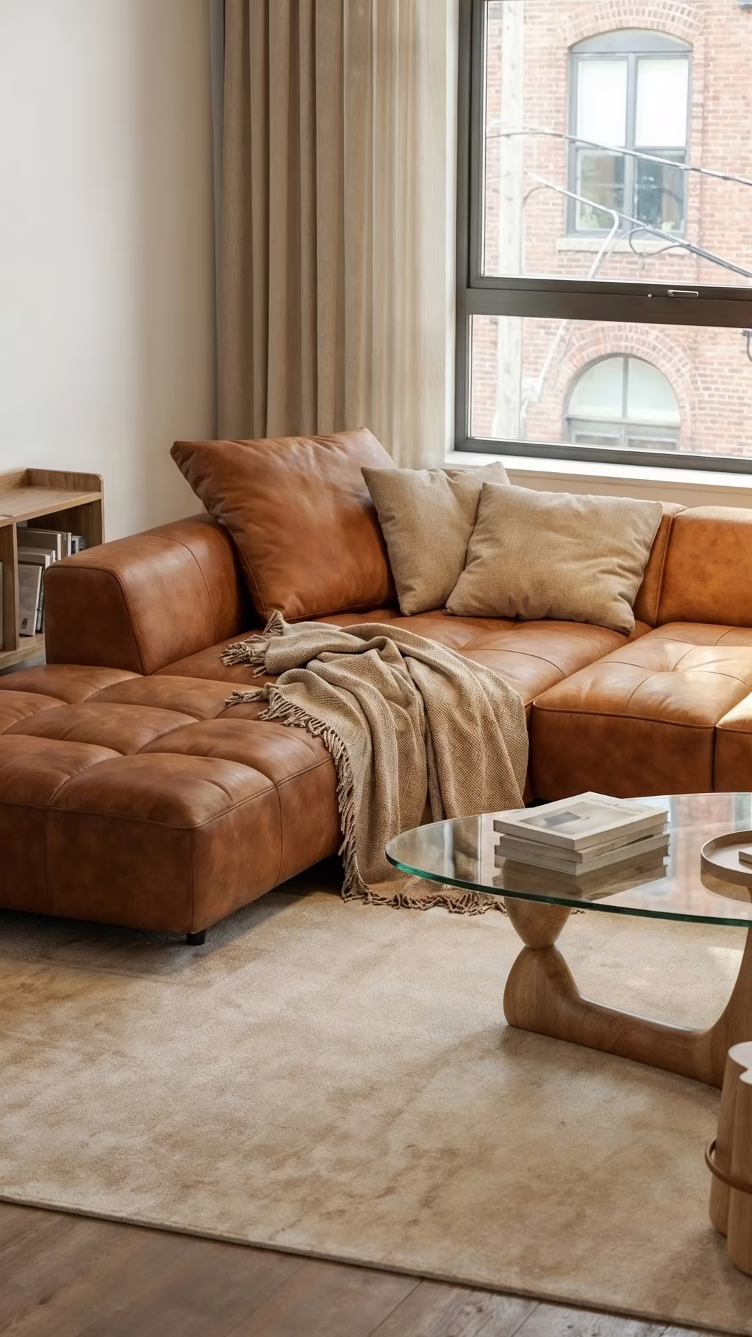 At the heart of the space sits a modular brown leather sofa. Its solid volume and smooth leather surface create a crisp contrast with the ceiling’s raw texture, while the warm tone elevates the overall atmosphere. Configured as a corner sectional with a chaise, the sofa defines zones for conversation and relaxation without obstructing circulation. The layout is also kept visually open toward the windows, ensuring that daylight and the exterior view become an integral part of the living-room experience from every seat.