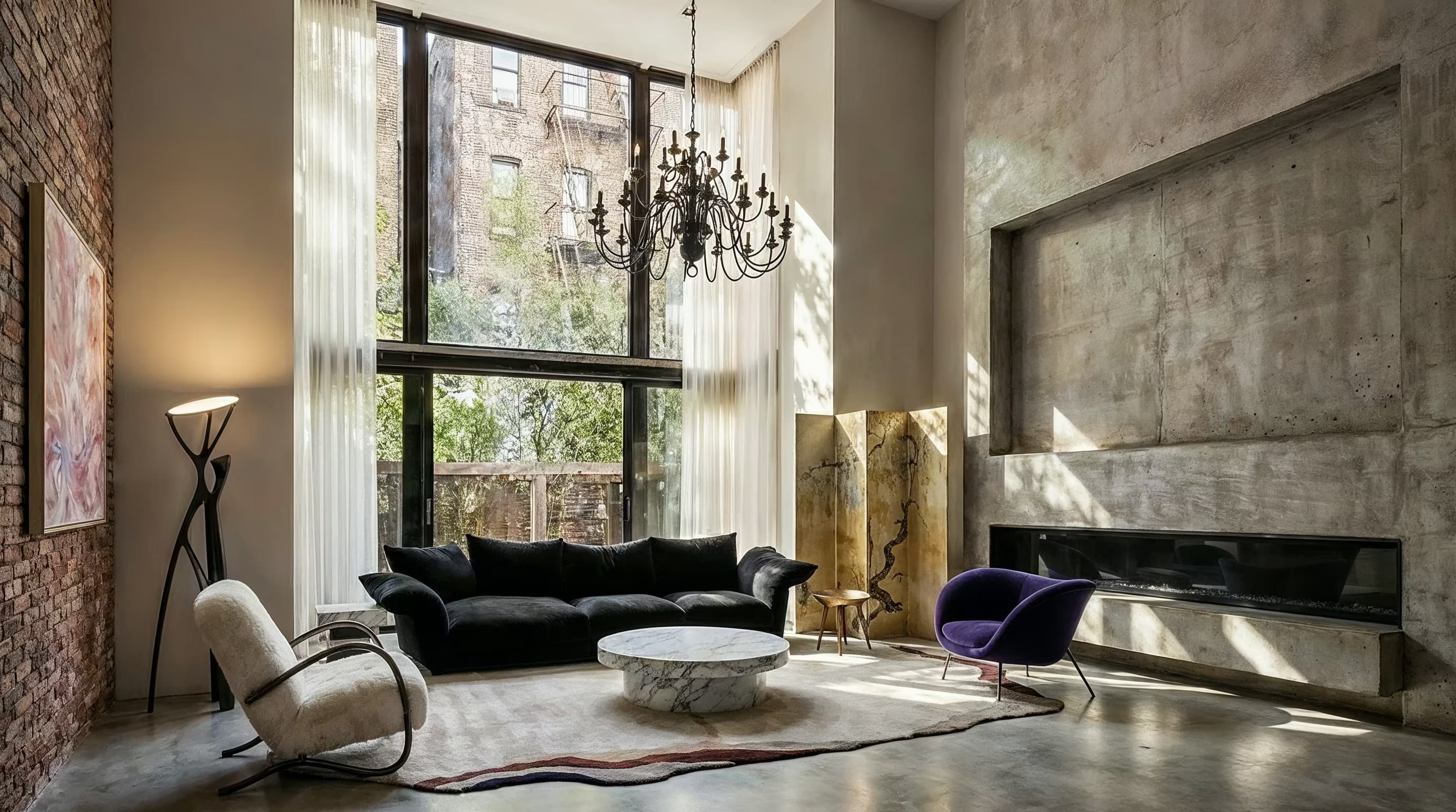 Luxury 8757 SF living room at 80 Washington Pl, NY. Dramatic skyline views, bold designer seating, and iconic lighting create an artistic haven.