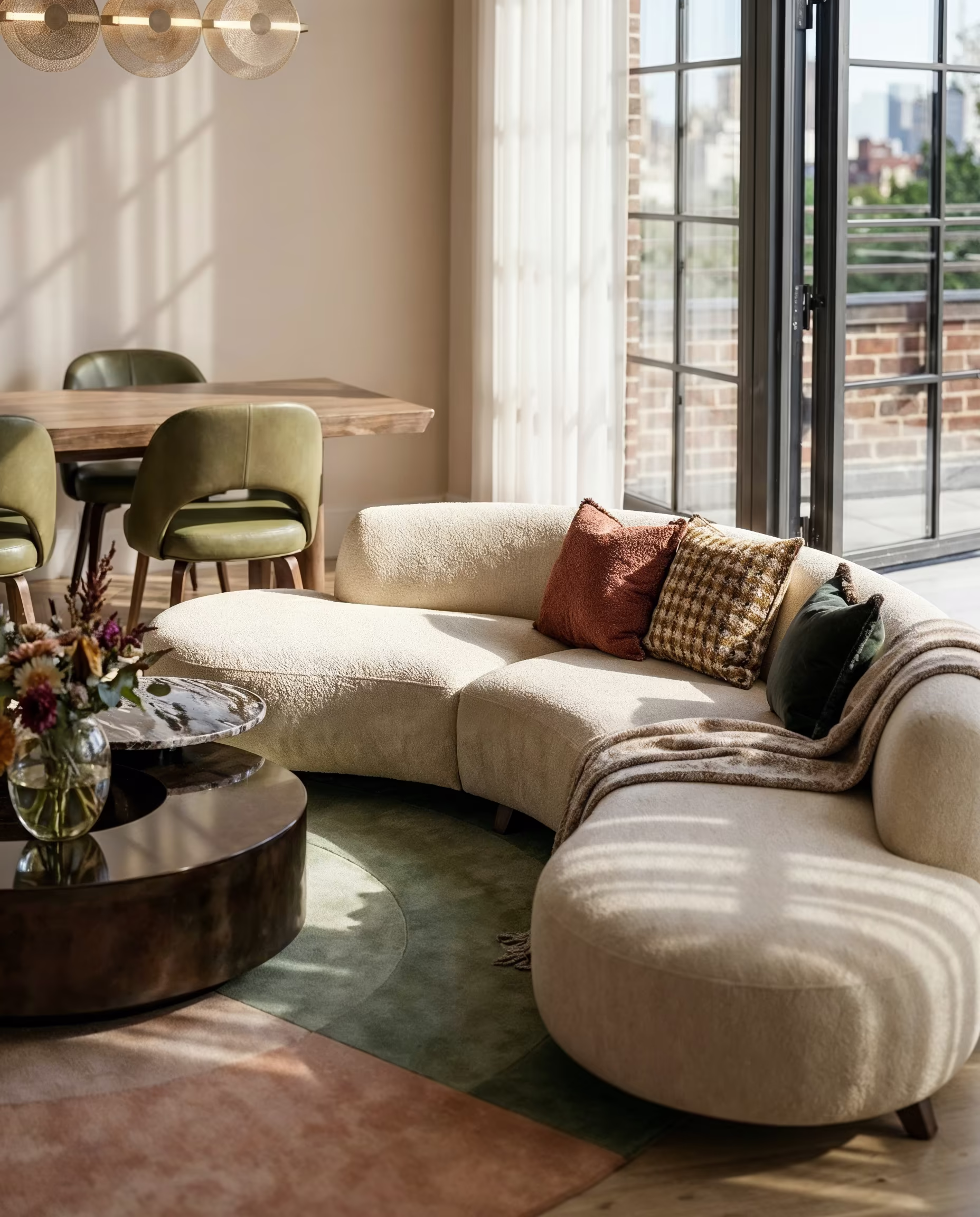 Ultimately, this space achieves a modern yet inviting living and dining lounge through an open sense of expansiveness that fully embraces natural light and terrace views, the gentle flow created by curved furniture, and a balanced interplay of dark accents and a colored rug. Within a framework of restrained forms, layers of refined materials and colors are thoughtfully built up, culminating in a high-end lifestyle that allows for a relaxed, unhurried daily life even in the heart of the city.