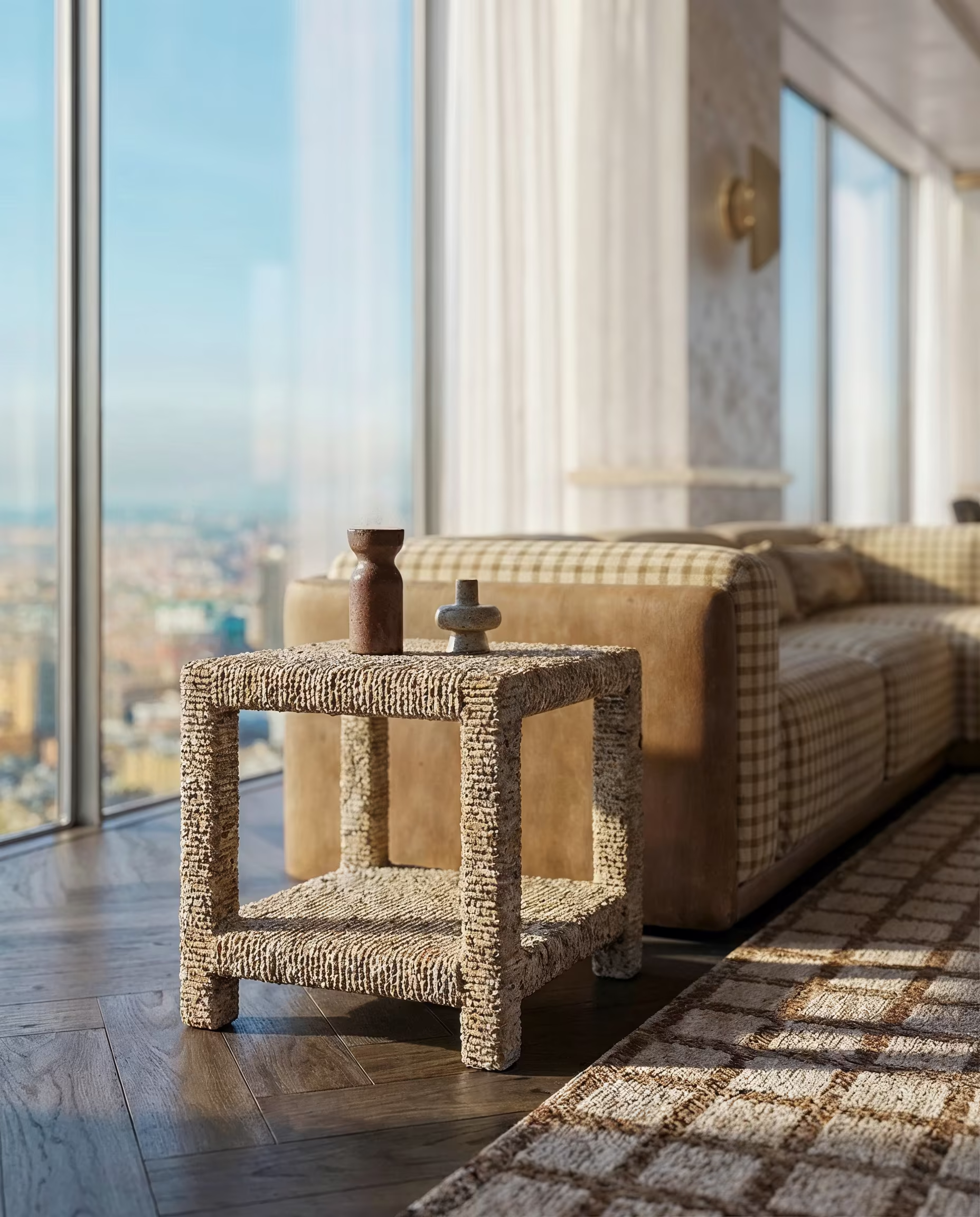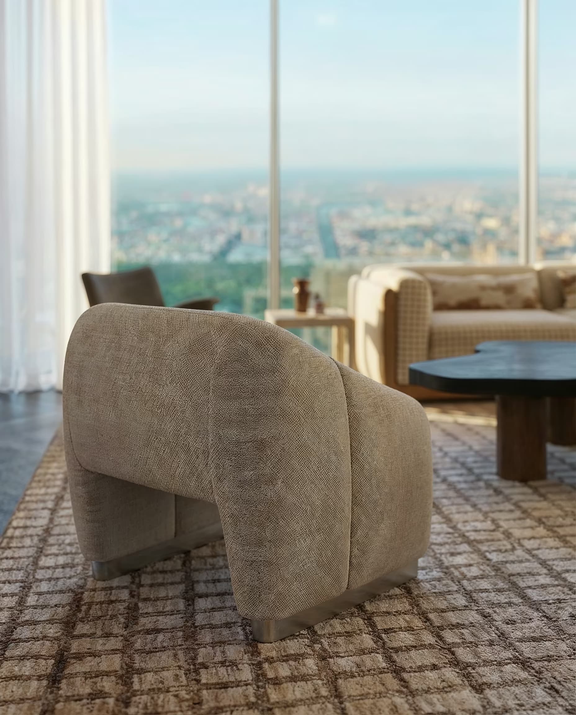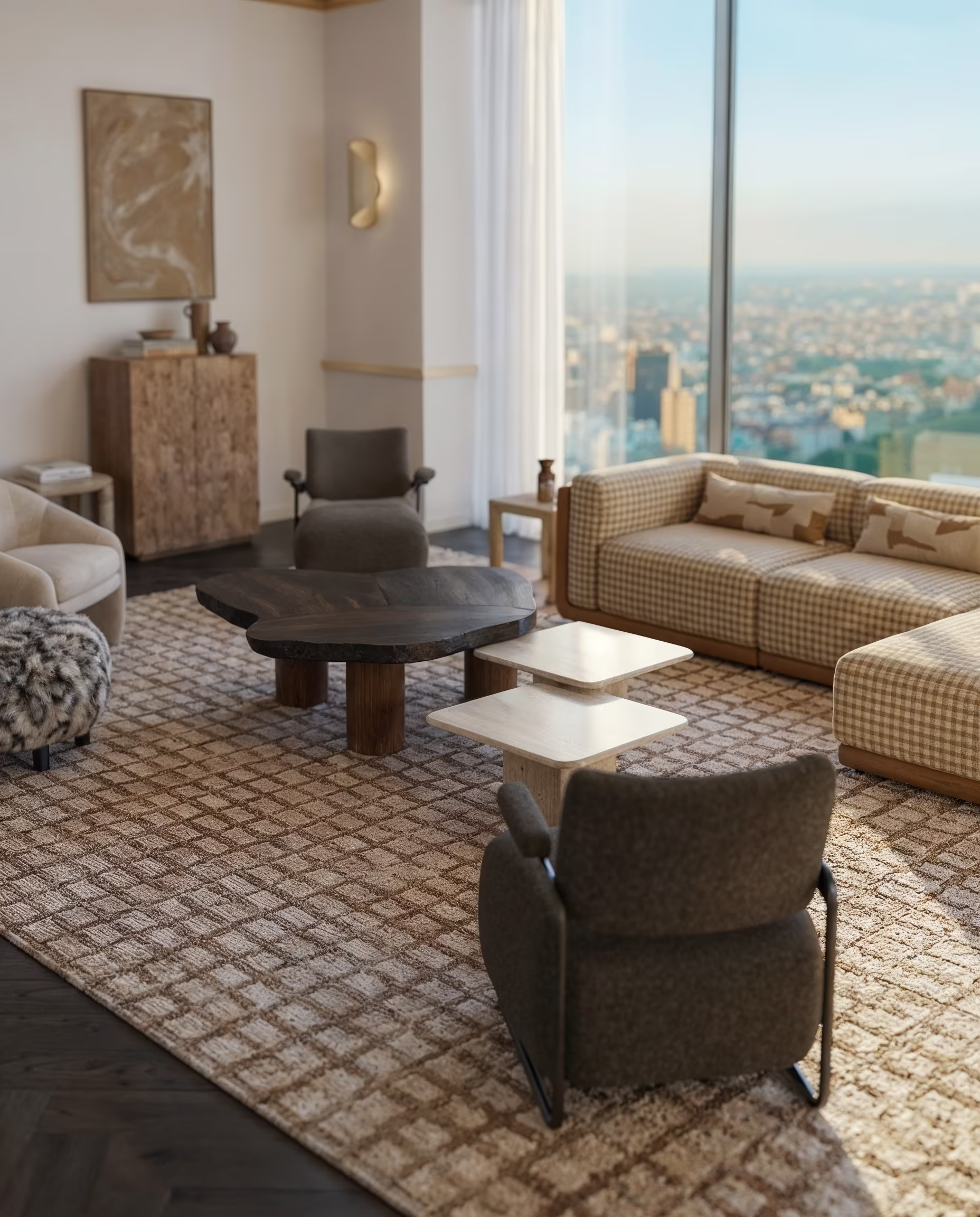The 11,480-square-foot luxury living room located in One Manhattan Square, New York, is completed as a refined retreat where nature-inspired tones, organically shaped furniture, and sweeping skyline views come together in harmony.