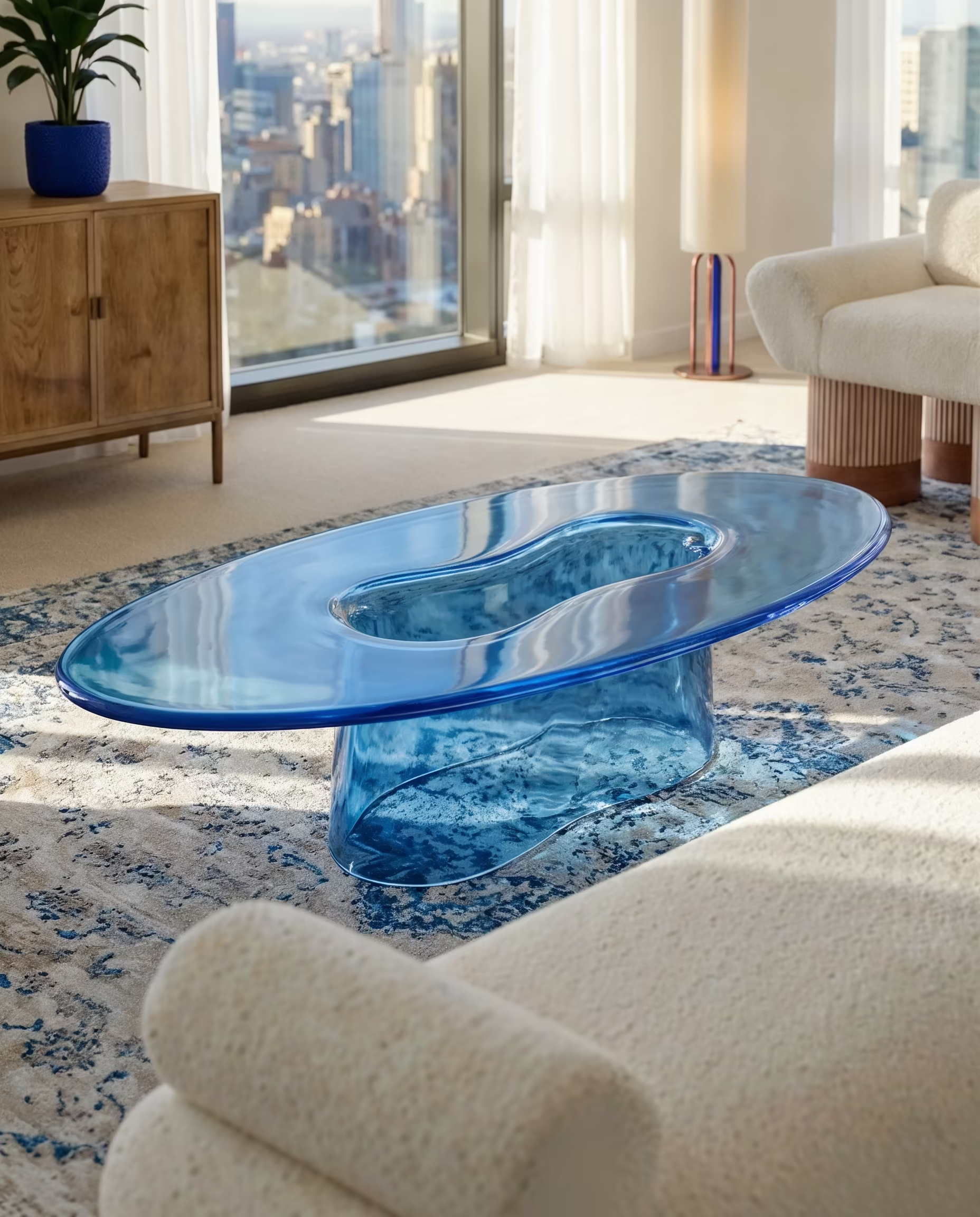 In a high-rise residence suspended above the city skyline, where urban rhythm meets quiet refinement, this open-plan living room embodies the cultivated lifestyle of a cosmopolitan design lover. Conceived as a single, flowing volume of lounge, dining, and bar, the space strikes a precise balance between relaxed minimalism and tailored luxury. Sculptural bouclé seating, a transparent blue coffee table, and fluted bases form a gallery-like composition at the center, while the investment in carefully selected contemporary pieces elevates the room from simply furnished to meticulously curated. Framed by floor-to-ceiling windows and veiled with sheer drapery, the home channels metropolitan sophistication yet remains a serene retreat for its owner. A foundation of warm ivory and sand is enriched with deep navy, rich burgundy, and natural wood, layering warmth and visual depth across the interior. High-end European-inspired furniture and collectible design objects serve as subtle statements of taste and global perspective, reflecting a lifestyle in which everyday living, intimate gatherings, and stylish entertaining coexist effortlessly within one expansive, light-filled space.