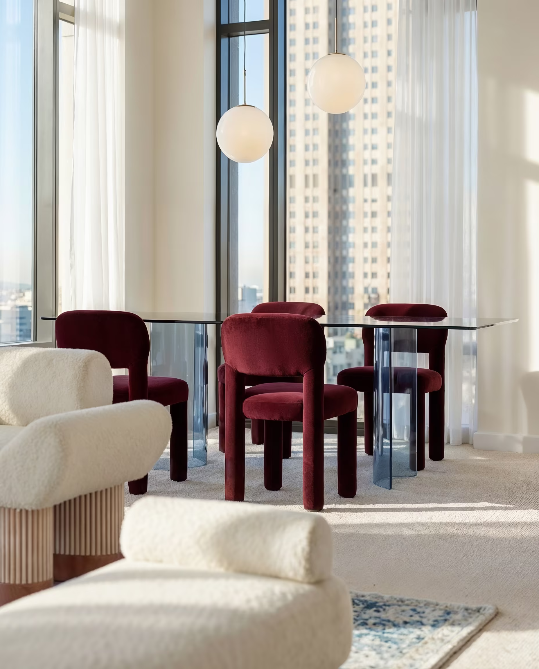 The designer envisioned a living space where natural light and sculptural furniture quietly define the scene. Floor-to-ceiling windows wash the room in a soft glow, turning the high ceilings and open plan into a gallery-like backdrop. At the center, a pair of boucle lounges and low armchairs in warm ivory anchor the room, their rounded silhouettes resting on graphic, fluted bases. A transparent blue coffee table and patterned rug echo the skyline beyond, layering color and reflection without adding visual weight. Along the perimeter, a simple timber sideboard, burgundy dining chairs, and matching barstools introduce depth and contrast, so that each zone—lounge, dining, and bar—feels distinct yet seamlessly connected within one cohesive composition.