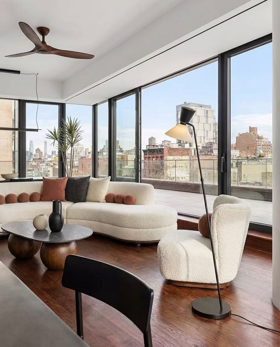 A 10000 SF Oriental home in NYC. Explore sculptural design, statement lighting, and sweeping city views in this luxury living room.