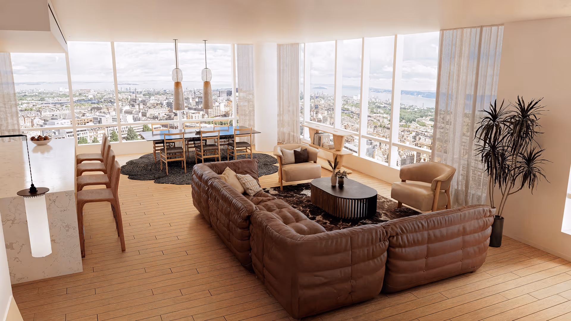 This high-rise urban residence showcases a refined high-end styling approach, where natural tones and organically curved furnishings create a balance of openness and comfort. The use of low-profile furniture enhances panoramic views, while thoughtful material contrasts bring rhythm and density to the space offering a curated lifestyle where functionality meets aesthetic sophistication.
